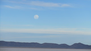 Our friend Annabelle had showed us her really cool light pics from two weeks before. Unfortunately, as beautiful as the full moon was and we were happy to be on the salt flats at that time, the brightness of the moon kind of ruined the visibility of our light pics. So even though we learnt how to write the SA letters upside down so that they would be reflected the right side up in the reflection, it didn't really come out like we had planned. It was also about minus ten degrees Celsius (as estimated by Kristen - which we took as truth- Canadians know their cold!) so we didn't spend too much time trying to take pics in the dark. Instead we all huddled in the heated van until first light appeared.
